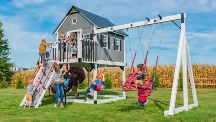 King Swings crafts modern playhouses with heirloom quality. Each playhouse is made to order by our Amish craftsmen, and then our crews deliver and install it in your backyard. We use premium-quality materials and deliver an unmatched customer experience. Bring the playground home with King Swings.